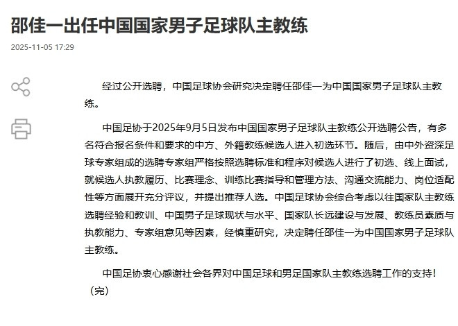 北京时间11月5日,中国足协正式宣布,45岁的邵佳一正式出任中国男子足球国家队的新任主帅,他将会带着外籍助教上任。这也意味着国足时隔3年半,再次重回“土帅时代”。