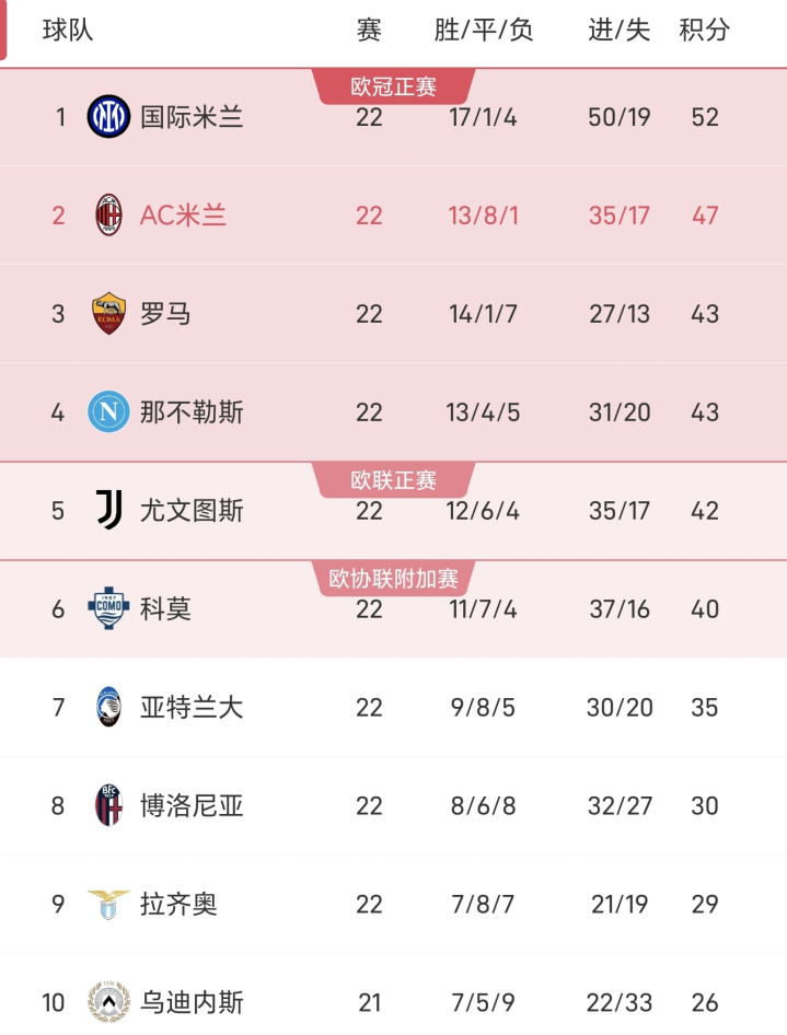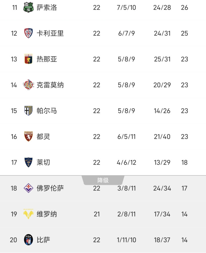 另一场比赛,萨索洛1-0克雷莫纳,随着比赛结束,意甲最新积分榜如下